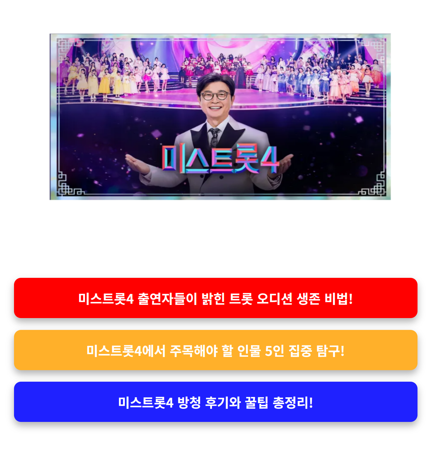 미스트롯4는 단순한 오디션 예능이 아니라, 트로트라는 장르의 문화적 가치와 대중성을 동시에 보여주는 프로그램입니다. 매 시즌 기대를 뛰어넘는 감동과 재미를 선사해온 만큼, 이번 시즌도 팬들의 마음을 사로잡을 것입니다.